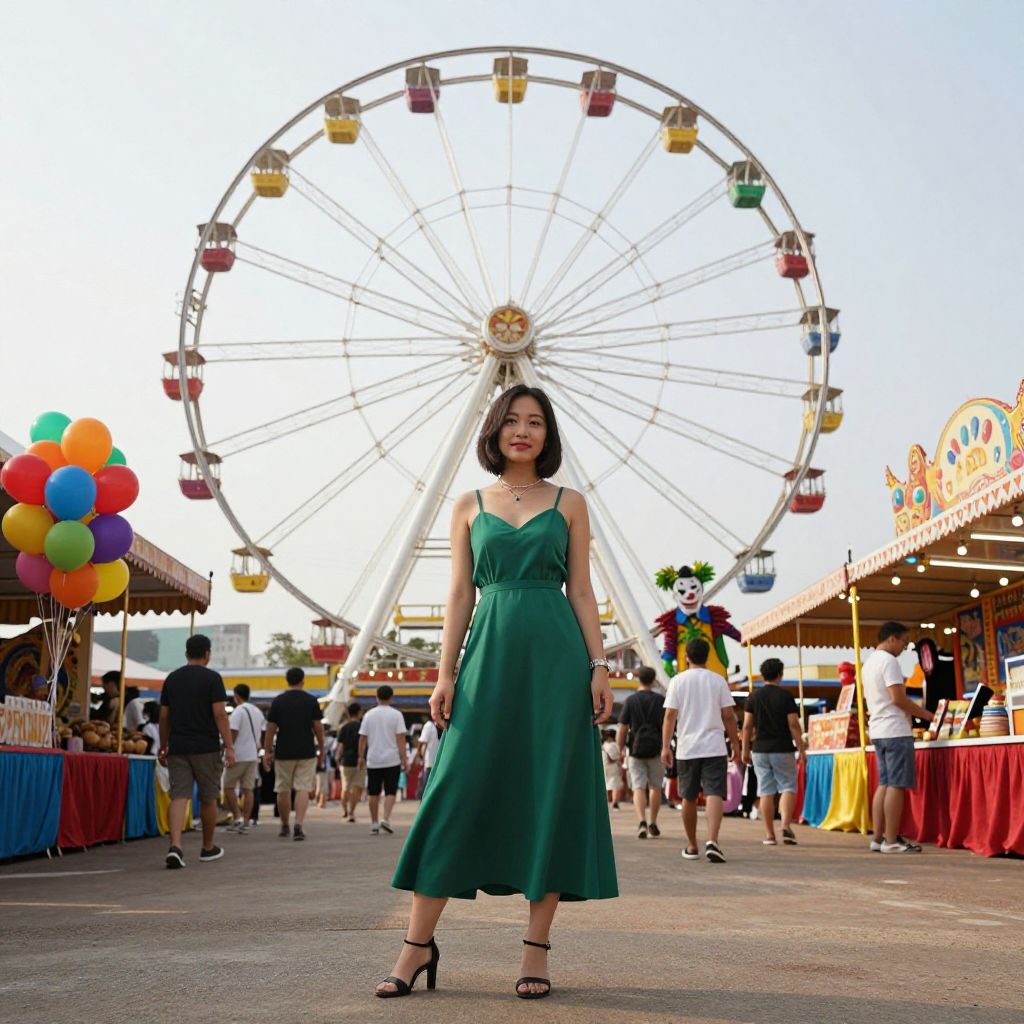 Photograph of a fairground scene featuring a young woman with short black hair, wearing a sleeveless, knee-length, dark green dress and black high-heeled sandals. She stands confidently in the center, with a large Ferris wheel in the background, adorned with colorful gondolas. To her left, there are clusters of brightly colored balloons, and to her right, various food stalls with yellow and red tablecloths. The fairground is bustling with people, mostly dressed in casual summer attire, walking and mingling. The sky is clear, and the overall atmosphere is lively and festive.