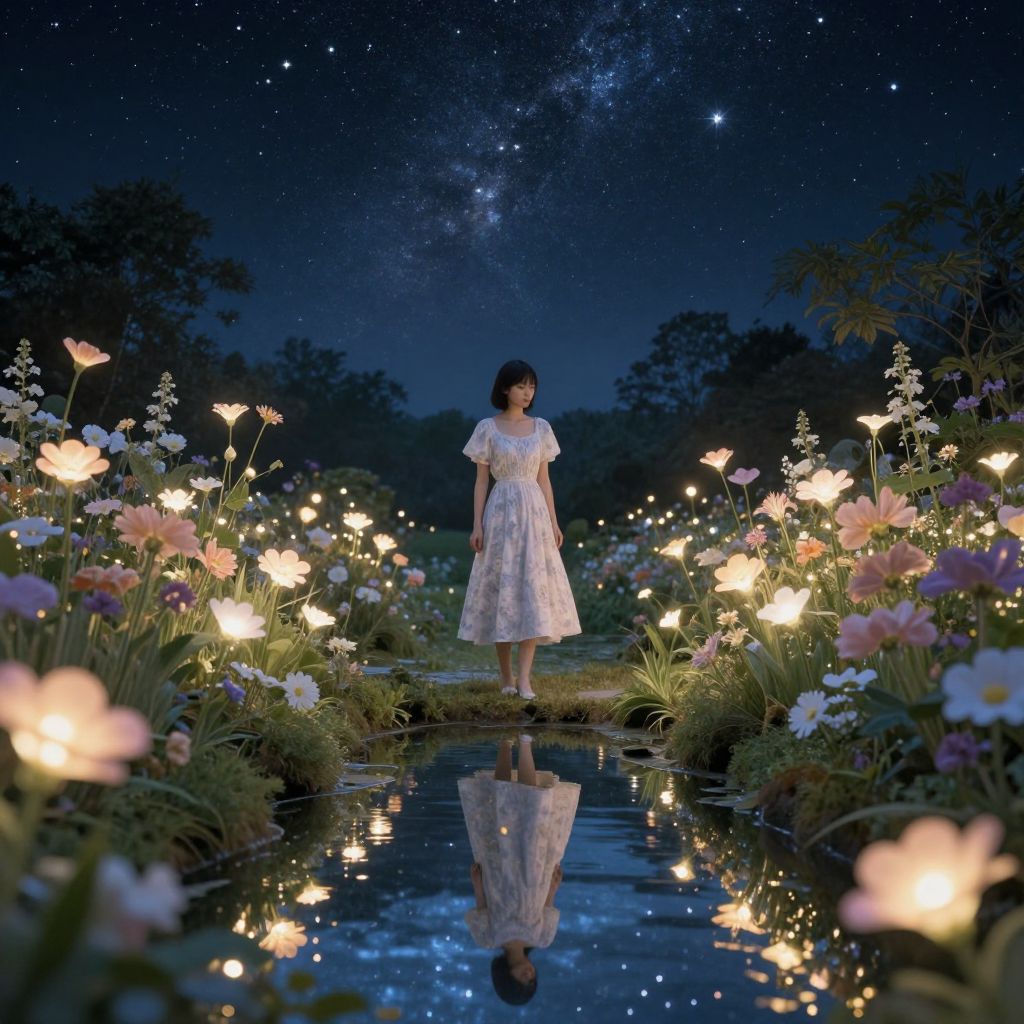 Photograph of a serene garden pathway lined with vibrant pink hydrangeas. A woman with long black hair, wearing a white dress, walks away from the camera towards a lush green hedge. Above, the clear blue water surface reflects upside-down images of people, creating a dreamlike effect. Sunlight filters through, casting a gentle glow. The pathway is narrow and flanked by the blooming hydrangeas, enhancing the peaceful, ethereal atmosphere. The image combines natural beauty with a surreal underwater element, blending reality and fantasy.
