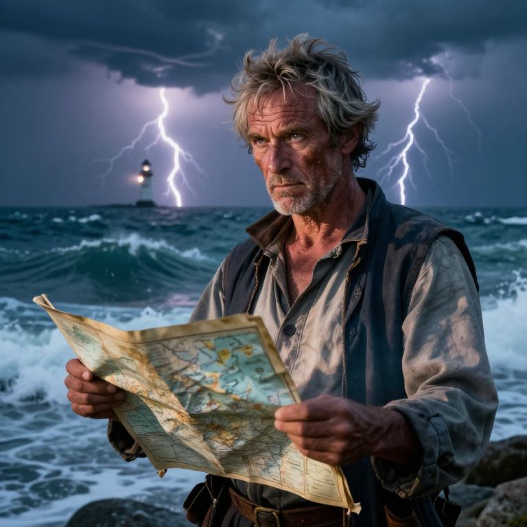 A captivating high-resolution double exposure portrait showcases a weathered sailor with deep creases and sun-bleached hair. His determined eyes capture the flickering light of distant lighthouses, while he stands resolute amidst stormy waves and lightning-filled skies. Clutching a tattered map that seems to ripple with the sea's energy, his attire emits soft light, casting long shadows across the turbulent waters and illuminating ethereal shapes between him and the storm. This image embodies resilience, adventure, and nature's unwavering power.
