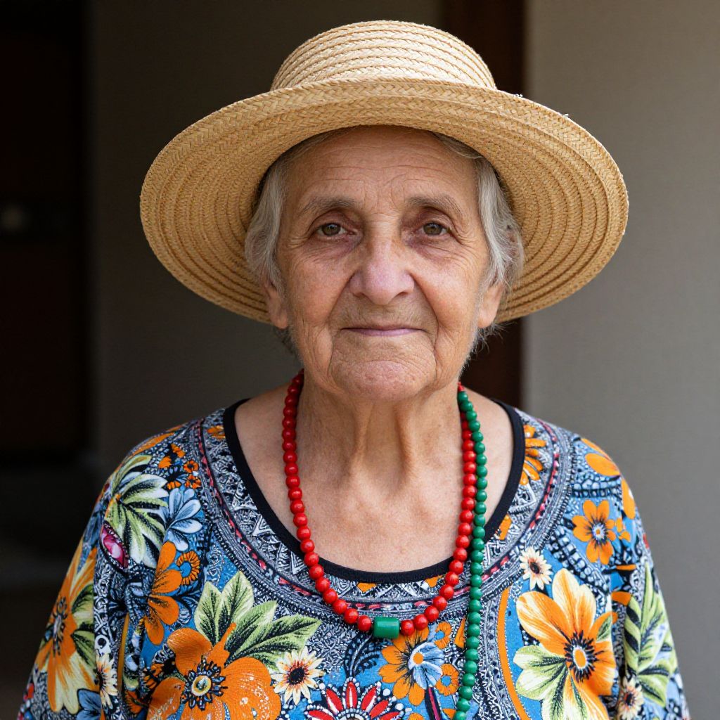 An elderly woman with kind, weathered eyes and a gentle smile, her grey hair gently flowing around her shoulders, is wearing an orange dress with a red collar and a red ribbon tied neatly around the waist. She has a large, wide-brimmed hat with a floral pattern on her head, adding a touch of vintage charm. She stands confidently in front of a weathered wooden door, the door slightly ajar, revealing a glimpse of a sunlit hallway. The scene is set in a quiet, old-fashioned cottage during early morning light, with soft golden rays filtering through the trees in the background. The atmosphere is warm, peaceful, and full of quiet dignity.