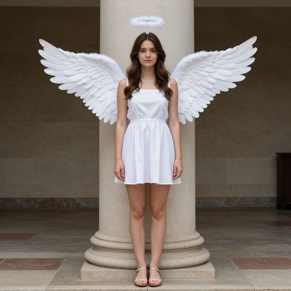 Photograph of a young woman standing in front of a stone column, wearing a short, white, sleeveless dress and white sandals. She has long, wavy dark brown hair and is adorned with large, white, feathered angel wings and a glowing white halo above her head. Her skin is light, and she has a neutral expression. The background is a dimly lit, indoor space with a tiled floor and a dark wall. The image has a slightly surreal, digital enhancement, emphasizing the angelic attributes. She stands with arms relaxed by her sides.