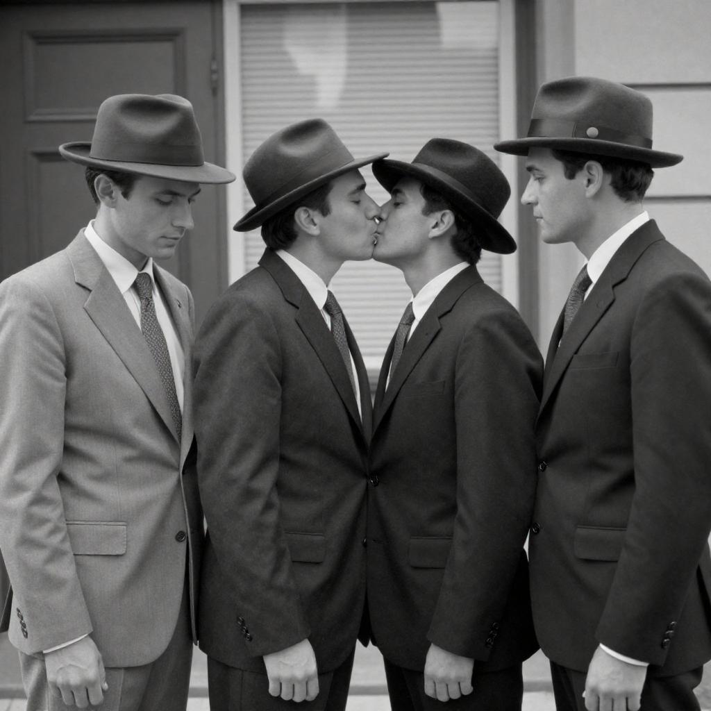 Illustration of two men in red and brown hats, smiling. Left man in red suit, right man in white suit with brown hat, holding cigar, light brown hair, red circle background. Both have visible badges, close-up, head and shoulders.