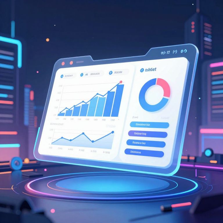 Digital illustration of a futuristic, glowing tablet displaying a bar chart and pie chart with neon-blue and pink accents. Background features neon-lit, cyberpunk