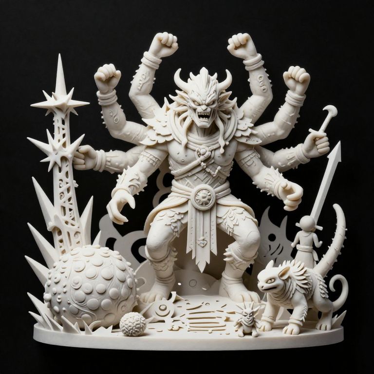 The image presents a highly detailed, dark fantasy scene with a black background, featuring intricate 3D white ink statues. The central figure is a menacing, multi-armed creature with a fierce expression, surrounded by various smaller figures and objects. To the left, a tall, spiky structure rises, while a large, round, textured object lies nearby. Several smaller figures, including a humanoid with a sword and a creature with a long tail, are scattered throughout the scene. The overall composition is dense and complex, with elements overlapping and interacting in a dynamic, almost chaotic manner. The textures range from smooth, polished surfaces to rough, sculpted details, creating a rich visual tapestry. The scene is reminiscent of a papercut or plush art style, with a sense of depth and dimensionality that enhances the fantastical atmosphere.