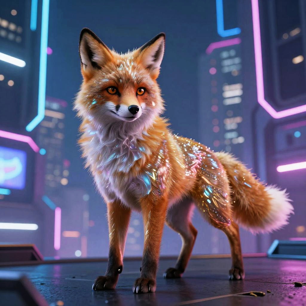 Blonde furry anthropomorphic fox in cyberpunk cityscape, neon lights reflection on shiny fur, dynamic pose, futuristic atmosphere