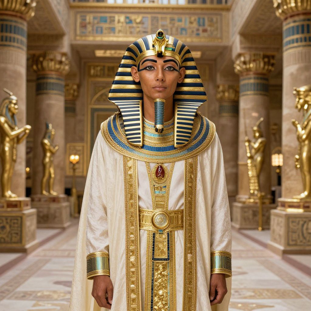 Imaginative scene: A dignified man, resplendent in ornate, gold-trimmed royal attire, inspired by the legendary pharaoh King Tutankhamun, stands regally within an opulent ancient Egyptian palace. The grand hall is filled with glittering golden artifacts, intricately carved stone pillars, and vibrant hieroglyph Man has masculine face and piercing eyes