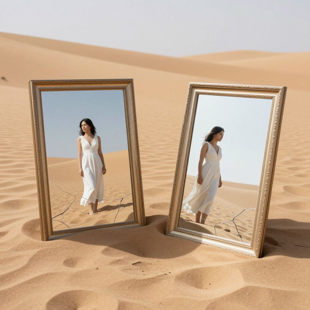 In a surreal desert landscape, two cracked mirror frames emerge from the sand, each containing a mirrored reflection of a woman in a white dress, defying the boundaries between reality and illusion.