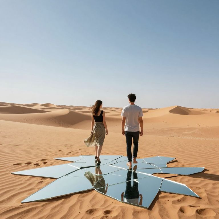 Aerial view of a large futuristic dome architecture in a desert landscape, with sand dunes in the background and the dome standing tall with a smooth, curved surface made of recycled concrete and solar panels. Inside the dome, a warm, natural light shines through, and a family is sitting on benches enjoying a sunny afternoon. The person in the foreground is a woman with curly brown hair and a neutral expression, watching the sky with interest.