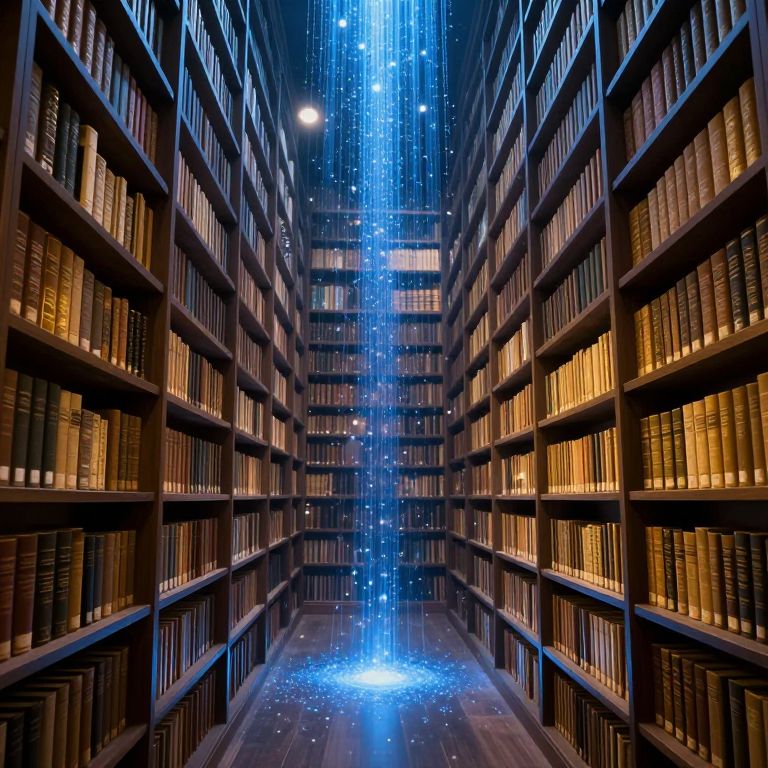 Rows of towering bookshelves lined with golden-hued books flank a shimmering aisle bathed in cascading blue light, creating an ethereal library where celestial particles dance above and below, evoking a sense of wonder and mystery.