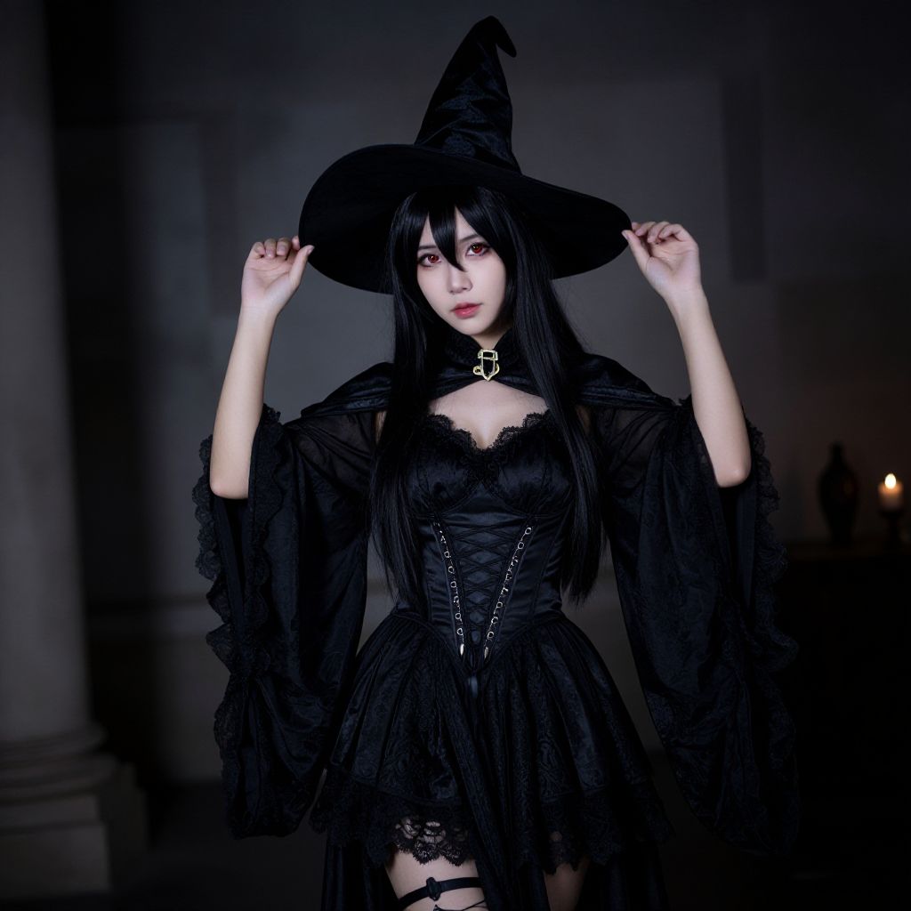 Photograph of an Asian woman with pale skin and long black hair, dressed as a witch. She wears a large, pointed black hat, a black lace corset with puffed sleeves, and a sheer black lace dress. Her makeup includes dark red lipstick and subtle eye shadow. She holds the brim of her hat with both hands. The background is dark and blurry, featuring dimly lit architectural elements. The image has a gothic, mystical atmosphere with a focus on her alluring and mysterious expression.