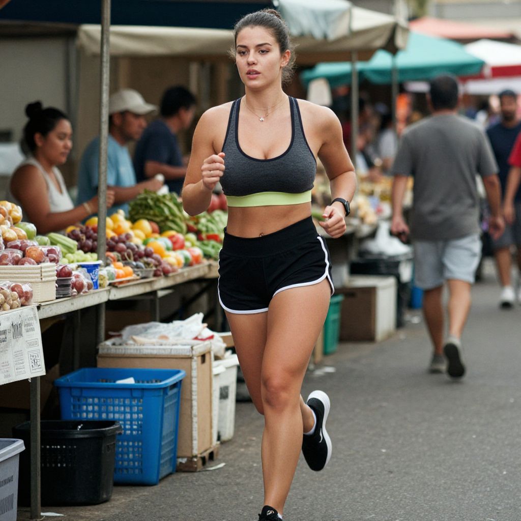 Photograph of a fit, brown-haired woman in black sports bra and shorts, running through a bustling outdoor market with colorful fruits and people in the background