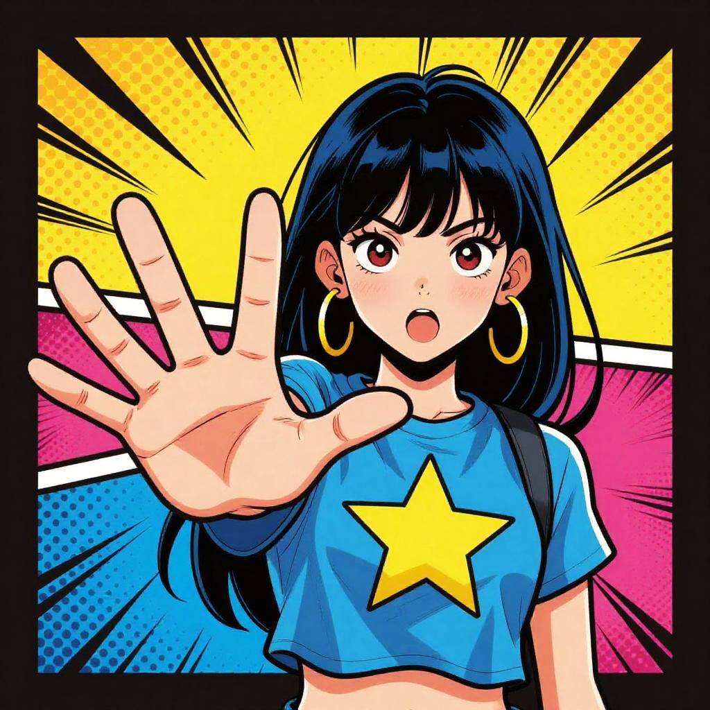 Stylized illustration of girl flipping off camera, bright pop art colors, exaggerated expression, comic book style background with bold lines and dynamic energy