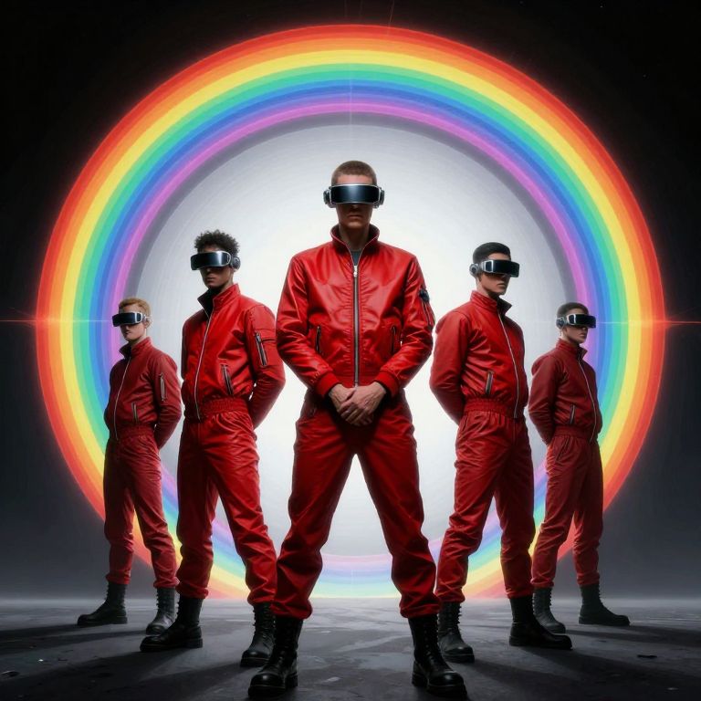 Photograph of four men in red jumpsuits and VR headsets, standing in a V formation, with a vibrant rainbow backdrop.