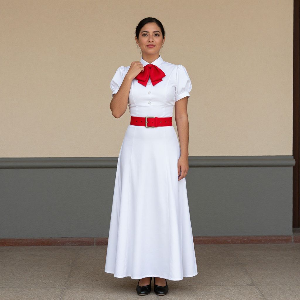 "White Mariachi Dress, woman in a white dress with a red belt"