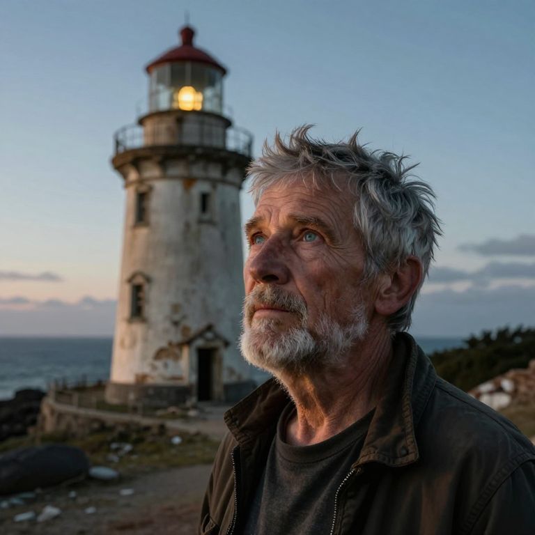 Photograph of an older white man with gray, tousled hair and a full beard, standing in front of a tall, weathered lighthouse. The man has a thoughtful expression, blue eyes, and is dressed in a dark jacket over a black shirt. The lighthouse, with a red roof and illuminated light, stands on a rocky coastline with the ocean in the background. The sky is a gradient of blue and pink, indicating either dawn or dusk. The man's skin is wrinkled, and the lighthouse shows signs of age and wear. The scene is serene and reflective.