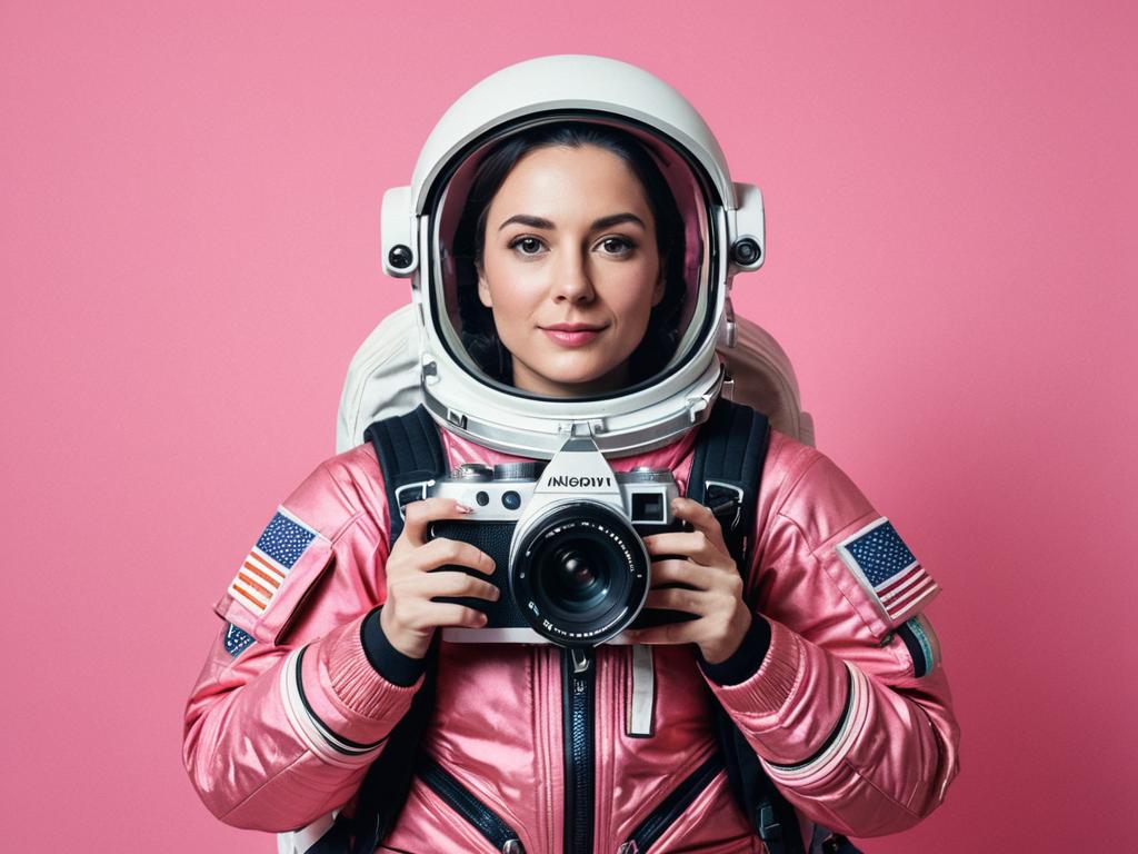 Portrait of a woman wearing a pink astronaut suit with American flag patches on the sleeves, holding a vintage-style camera. The astronaut helmet is on, and she is set against a plain pink background. The woman has a confident expression and dark hair.