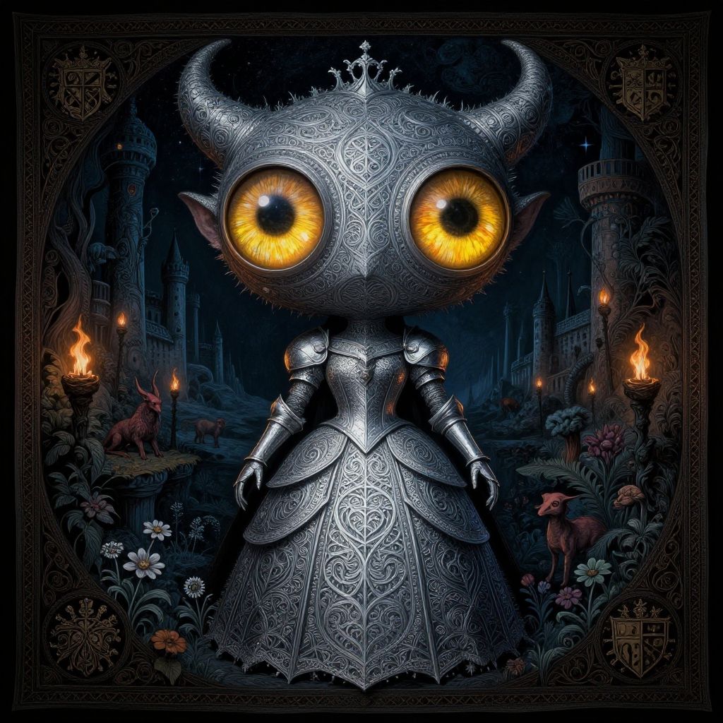 Digital art of a small, armored, demonic figure with large, glowing orange eyes and intricate silver armor. The figure has large, curved horns and a crown, standing in a dark, medieval forest with tall, gothic-style castle towers in the background. The armor is ornate with swirling patterns, and the figure wears a full-length, elaborately detailed dress. Surrounding the figure are small, glowing torches and dark, shadowy foliage. The image has a rich, dark color palette with a gothic, fantasy style and a detailed, textured appearance.
