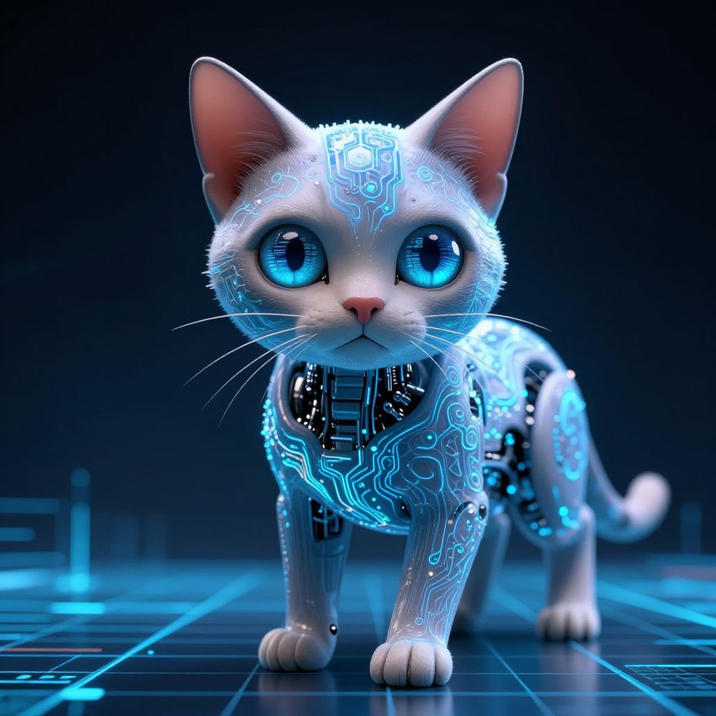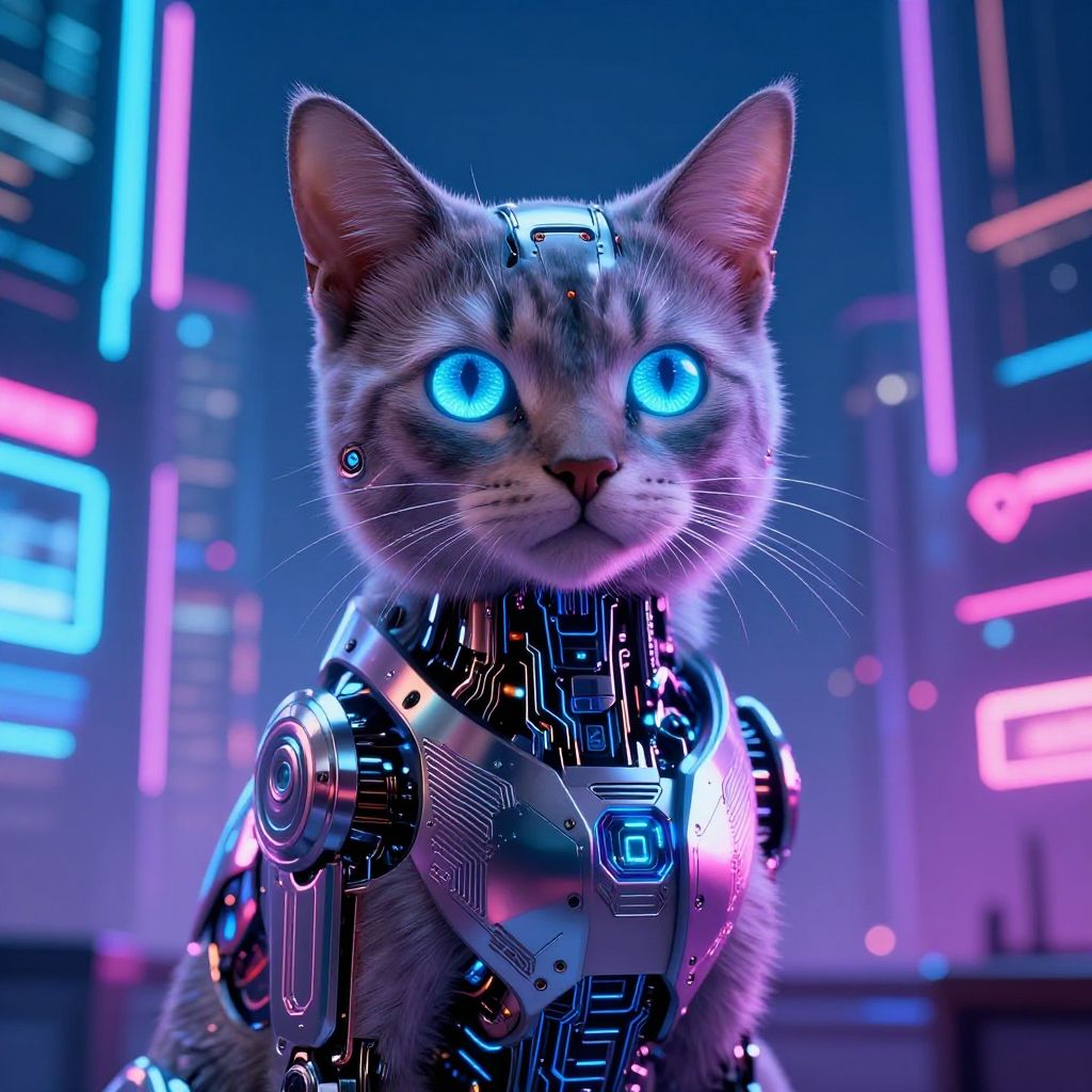 AI cat generator creating a variety of futuristic feline companions in vibrant neon colors, sleek metallic fur, glowing eyes, and intricate circuit patterns blending technology with adorable cat features, set in a cyberpunk cityscape environment.