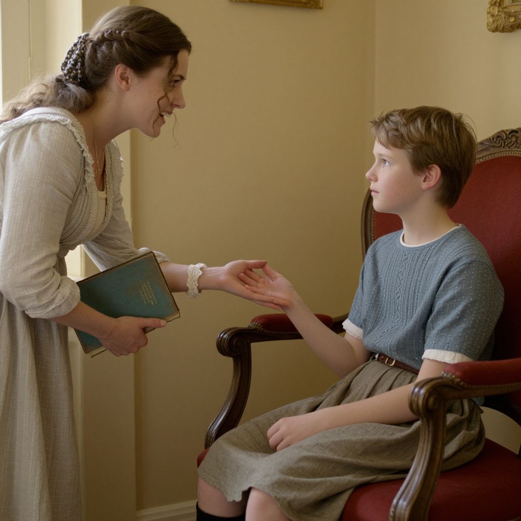 Woman extending her hand toward a seated child in a warmly lit interior, both dressed in period attire, with the woman holding a book and the child sitting on a red upholstered chair.