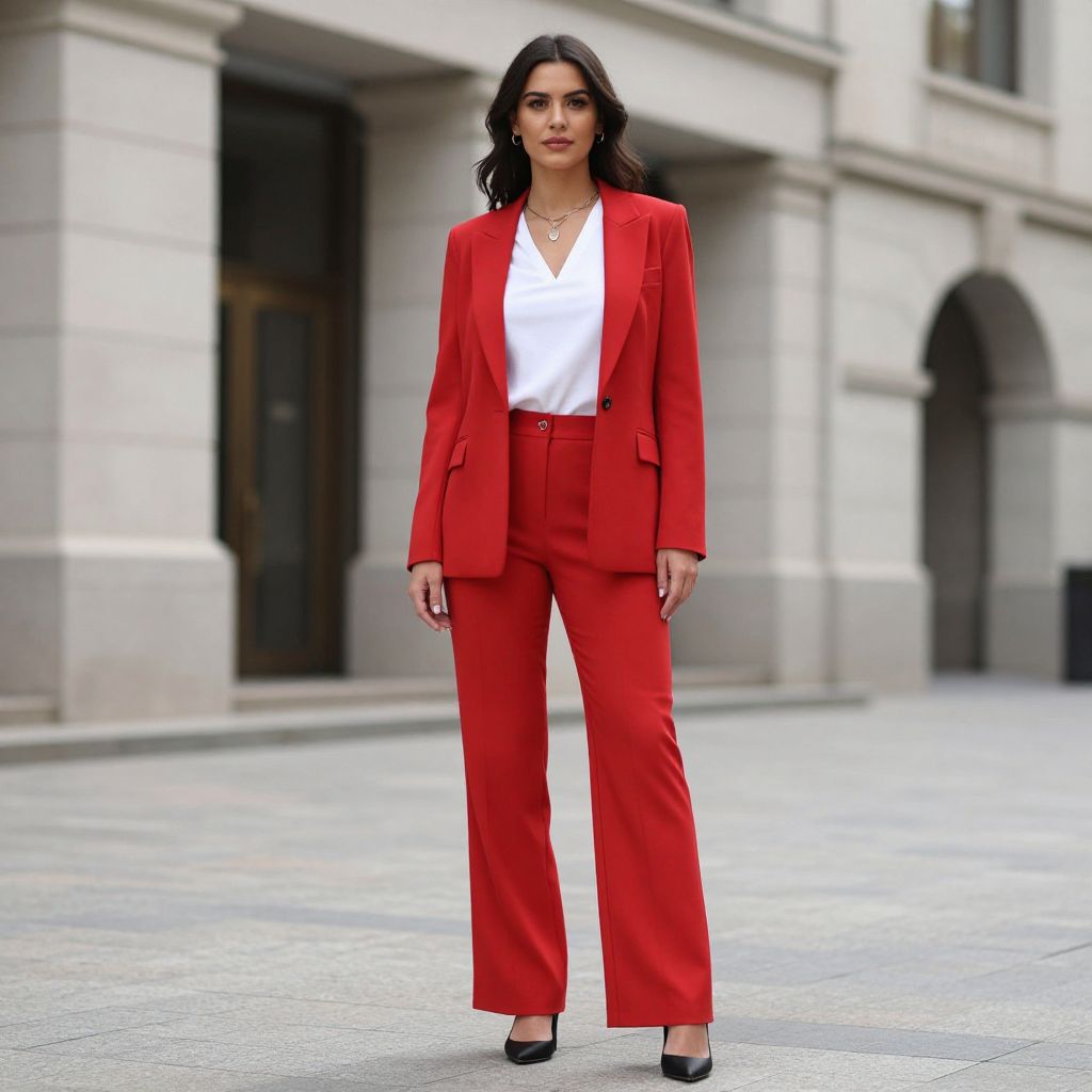 Red Costume Suit, woman in red jacket and white shirt standing in front of a building