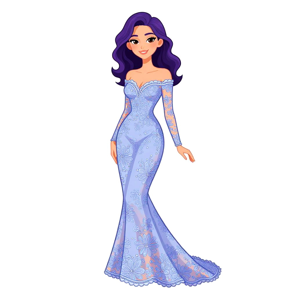 Woman with pretty face and pretty hair. smiling Woman, romantic elegance, off-the-shoulder lace gown in pale blue, sweetheart neckline, long sleeves, body-hugging silhouette with mermaid skirt, floral lace overlay with beaded accents, scalloped edges, train at the back, soft curls, minimal jewelry, isolated on a white background. --sref 1461