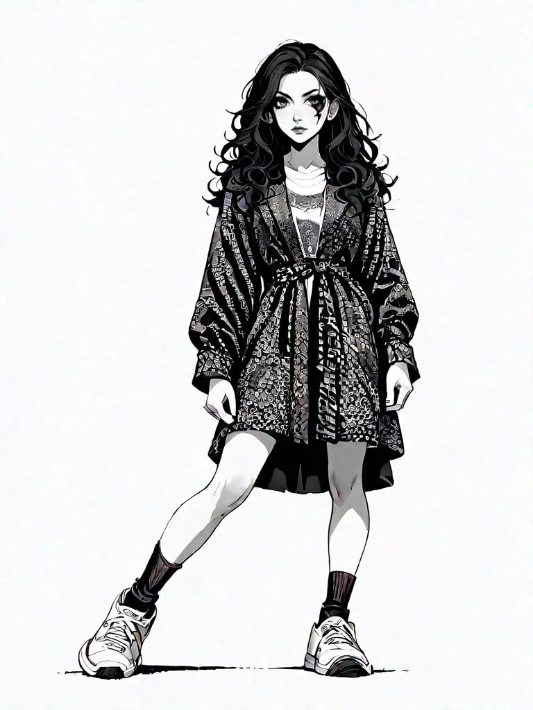 1girl, source_comics, realistic face, full body shot, Woman, preppy, tweed mini dress in dark tones, V-neck with contrasting white and black striped trim, short sleeves, straight cut, thigh-length, paired with a metallic envelope clutch with black and white detailing.