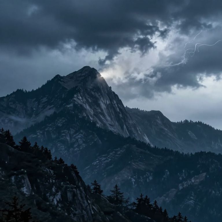 Photograph of a dramatic mountain landscape under a stormy sky. Dark, towering peaks with jagged edges dominate the center, partially shrouded in mist. Pine trees silhouette the lower foreground. The sky is filled with thick, dark clouds, with a bright, white lightning bolt striking from the upper right. The light from the lightning illuminates the clouds and the peak, creating a stark contrast between the dark mountains and the bright, glowing sky. The overall color palette is dark blue and black, with the lightning providing a stark white highlight.