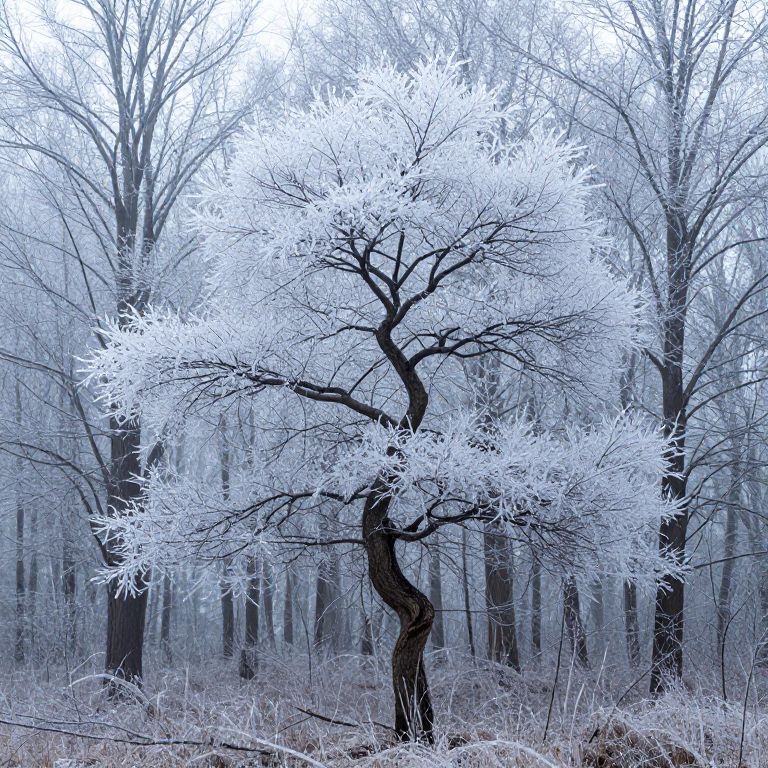 A solitary, serpentine tree stands defiantly in a frosty forest, its branches adorned with crystalline foliage that defies the barrenness of winter, as if capturing the ethereal whispers of forgotten echoes.