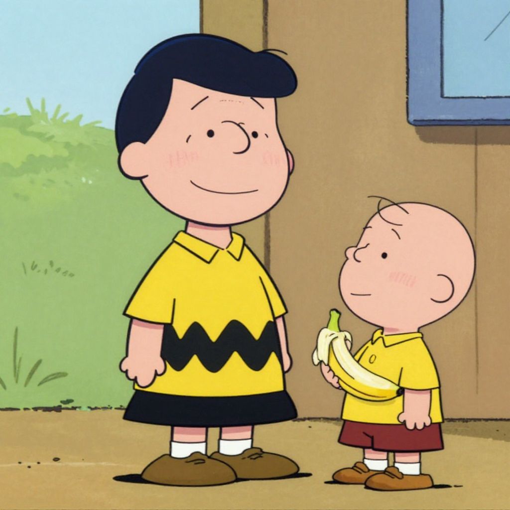 "Woman Charlie Brown, young boy that is holding a banana in his hand"