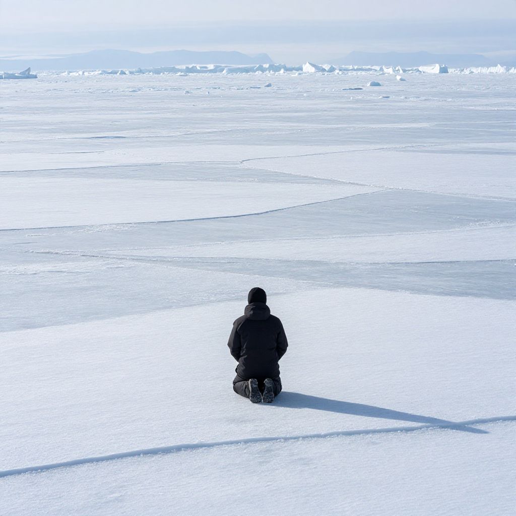Amidst the vast expanse of shifting ice, a solitary figure kneels in contemplation, their presence a fragile testament to the impermanence of human endeavor against the relentless march of nature’s eternal transformation.