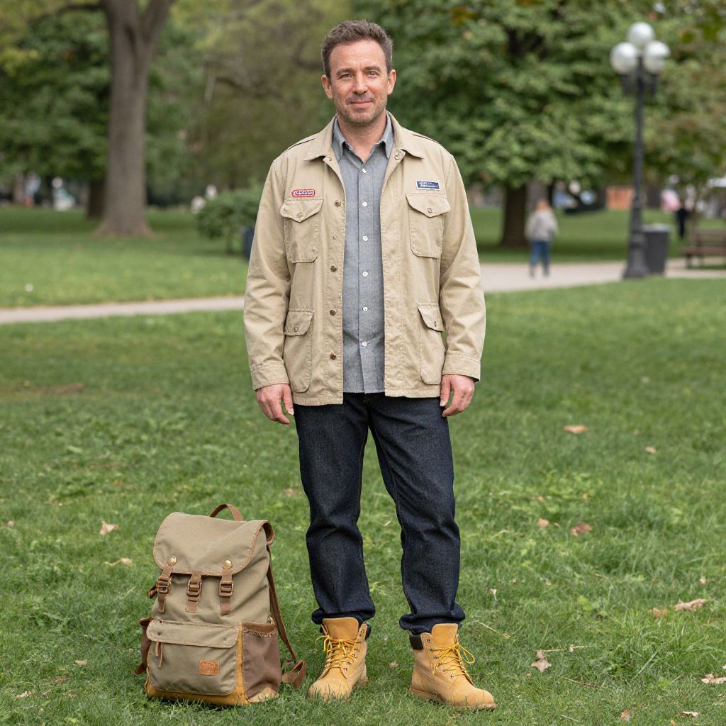 Photograph of a Caucasian man with short brown hair and a beard, standing on a grassy park path. He wears a beige outdoor jacket with patches on the chest, a blue button-down shirt, dark blue jeans, and yellow work boots. Beside him is a beige backpack with brown leather straps and buckles. The background features green trees, a blurred lamp post, and a few distant park-goers. The image has a slightly enhanced, almost CGI-like quality.