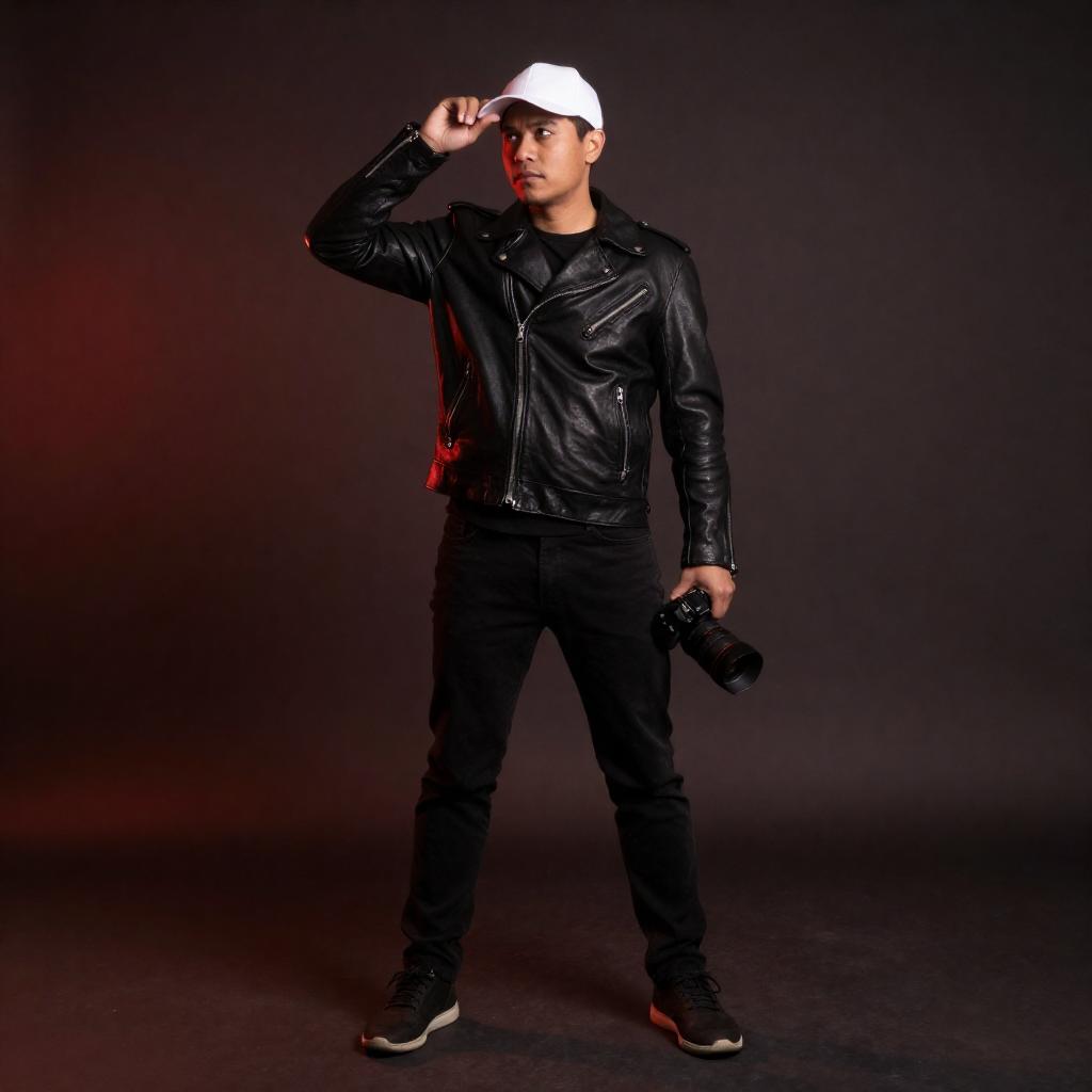 Photograph of a man in a black leather jacket, black pants, and white cap, holding a camera with a lens attached. He is standing on a dark, ured ground with a smoky, reddish-brown background. He has a focused expression, looking to his right, with his right hand raised to his cap. The man is positioned slightly to the left of the center. There is a in the bottom left corner.