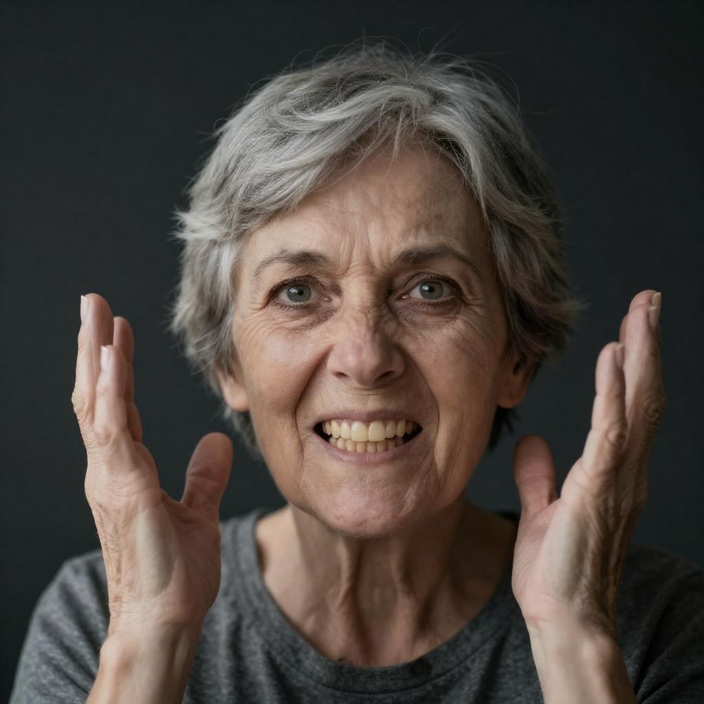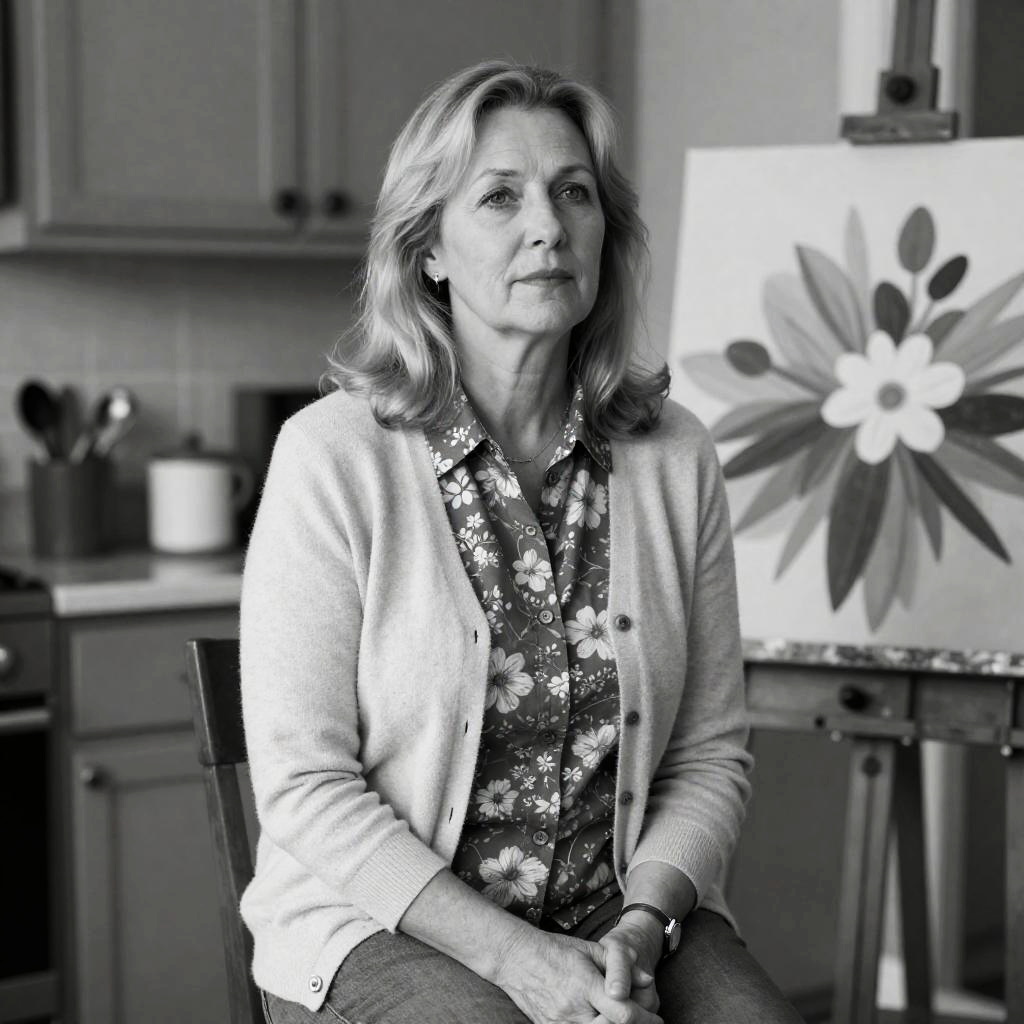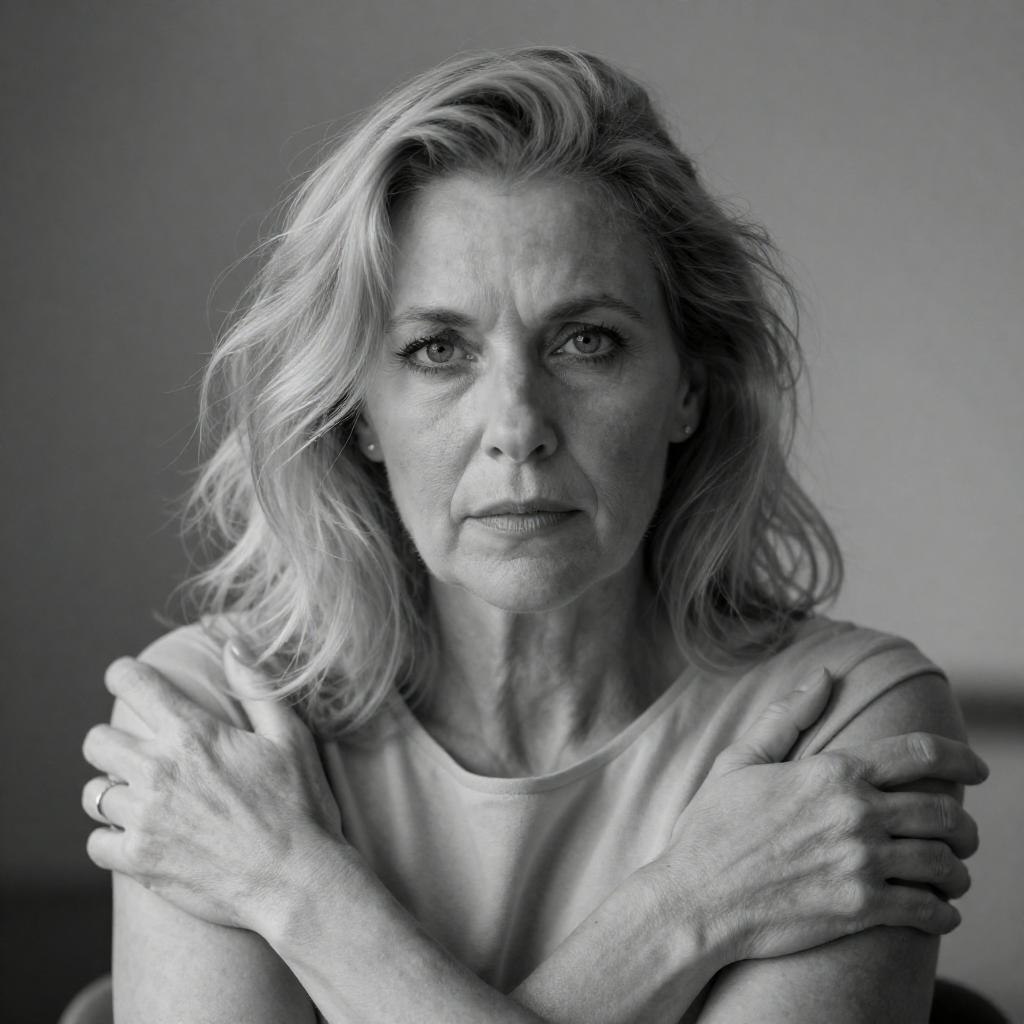 Photograph of a middle-aged woman with light-colored, wavy hair, light skin, and intense gaze. She holds her arms close to her chest, wearing a light-colored top. Background is blurred and gray. Her expression is serious and contemplative. Monochromatic blue-gray tone. Number of people: 1.