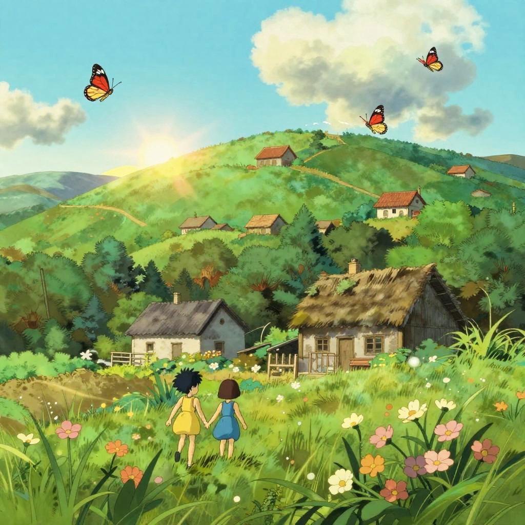 Digital anime-style illustration of a vibrant, sunlit countryside. Two children with short dark hair, one in a yellow shirt and blue skirt, the other in a blue shirt, stand in a lush, flower-filled meadow. Behind them, small, rustic wooden houses with thatched roofs dot a green hill. Bright red and black butterflies flutter in the bright blue sky with soft, white clouds. The sun shines from the top left, casting warm light over the scene. The overall atmosphere is peaceful and idyllic.