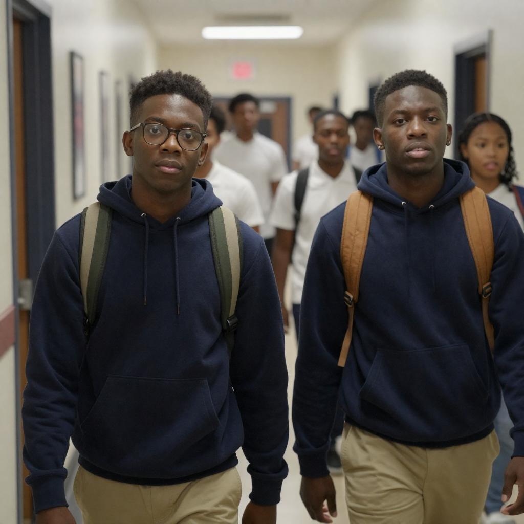 Photograph of two African American male students in a hallway, both wearing navy blue hoodies and beige backpacks. One student has glasses and a green backpack, the other has a brown backpack. Background shows other students in white shirts, moving down the hallway. Intense expressions on both students' faces. Busy, crowded hallway with doors and framed pictures on the left.