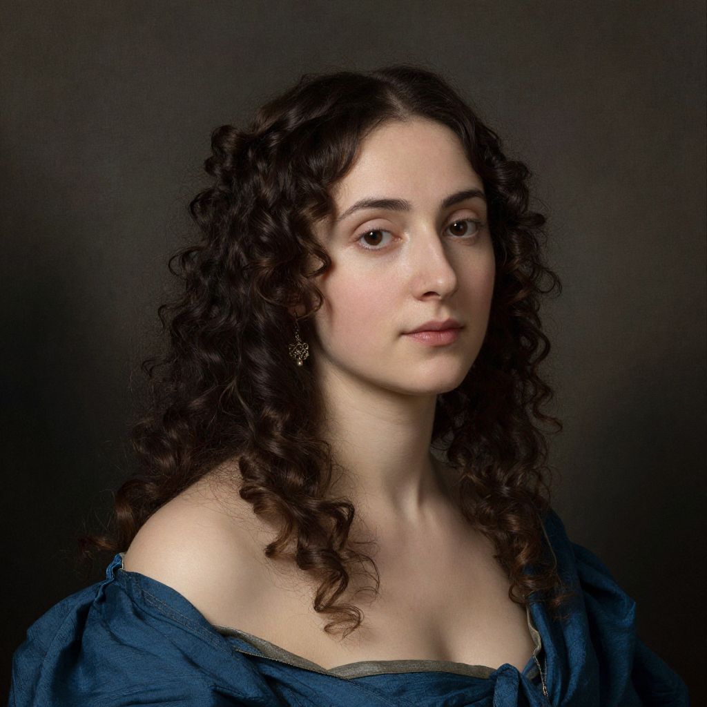 Guido Cagnacci's portrait captures a woman with voluminous dark curls cascading around her shoulders, adorned with a delicate earring, and dressed in a deep blue garment that frames her bare shoulders against a muted background.