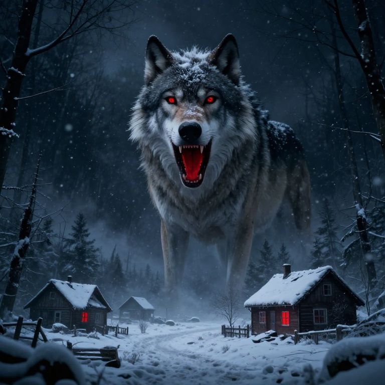 Digital artwork of a massive, glowing-eyed wolf with an open mouth, looming over snow-covered, dark forest cabins with red-lit windows.