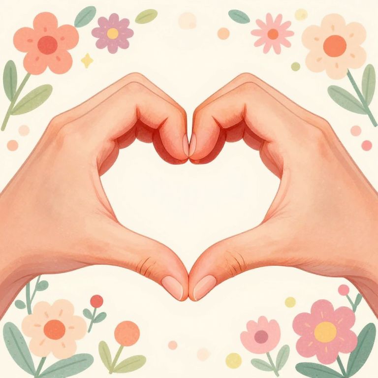 Heart finger pose illustrated with vibrant colors, hands forming heart shape, surrounded by floral patterns and gentle pastel hues, whimsical and dreamy style