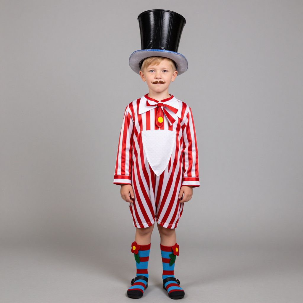 Mad hatter childrens costume, solo, hat, 1boy, top hat, male focus, striped clothes, blonde hair, flower, striped socks, mustache, socks, looking at viewer