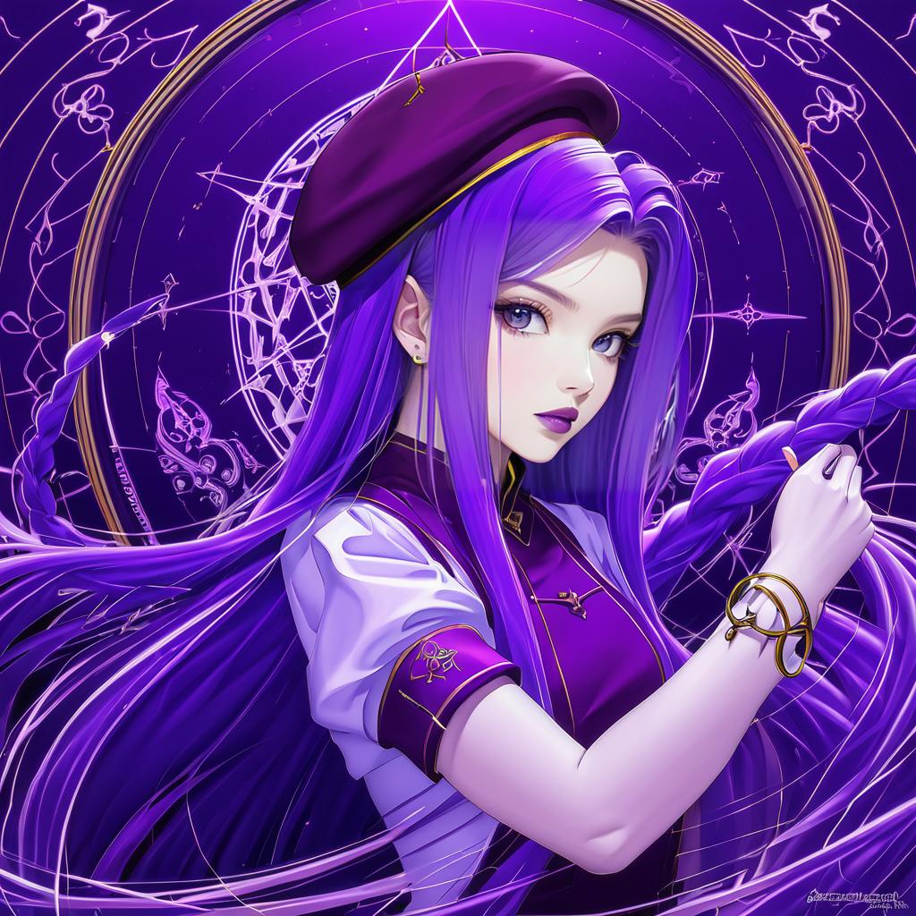 Sion eltnam atlasia, tsukihime, 1girl, purple eyes, purple hair, very long hair, long hair, single braid, bracelet, beret, by artist alphonse (white datura), anime