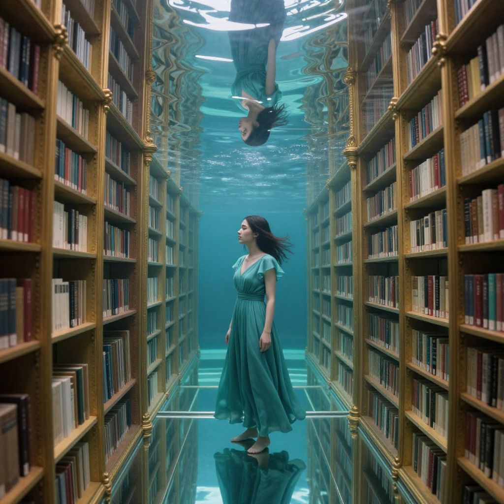 Photograph-like digital art: A woman in a teal dress stands in a narrow, underwater library aisle with mirrored ceiling, reflecting her upside-down image between