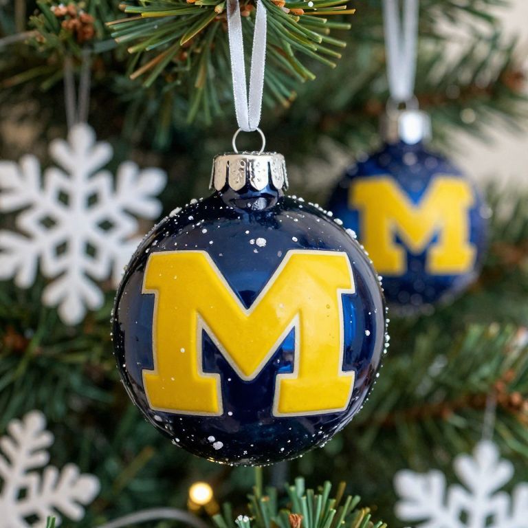 Three festive University of Michigan Wolverines Christmas tree ornaments, featuring maize and blue colors, hang gracefully from pine branches, adorned with intricate snowflake patterns and bold \"Wolverines\" text alongside the iconic \"M\" logo.