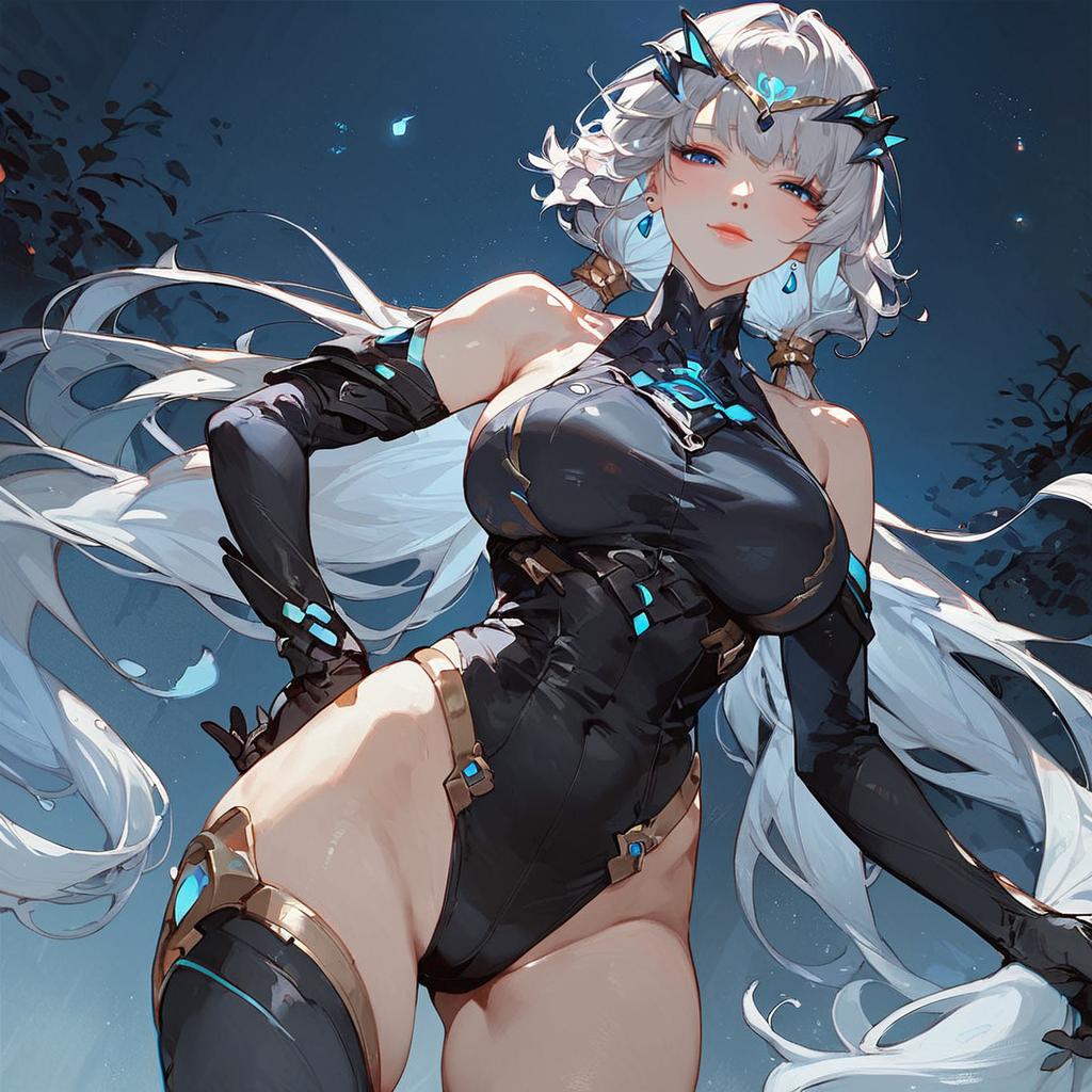 Score_9, score_8, score_7, source_anime, 1girl, angela balzac, rakuen tsuihou, low twintails, deva battle suit, large breasts, thighlet, bare shoulders, standing, looking at viewer, smile, hand on own hips, glowing, outdoors, night, moonlight, dark, cowboy shot, solo, dutch angle
