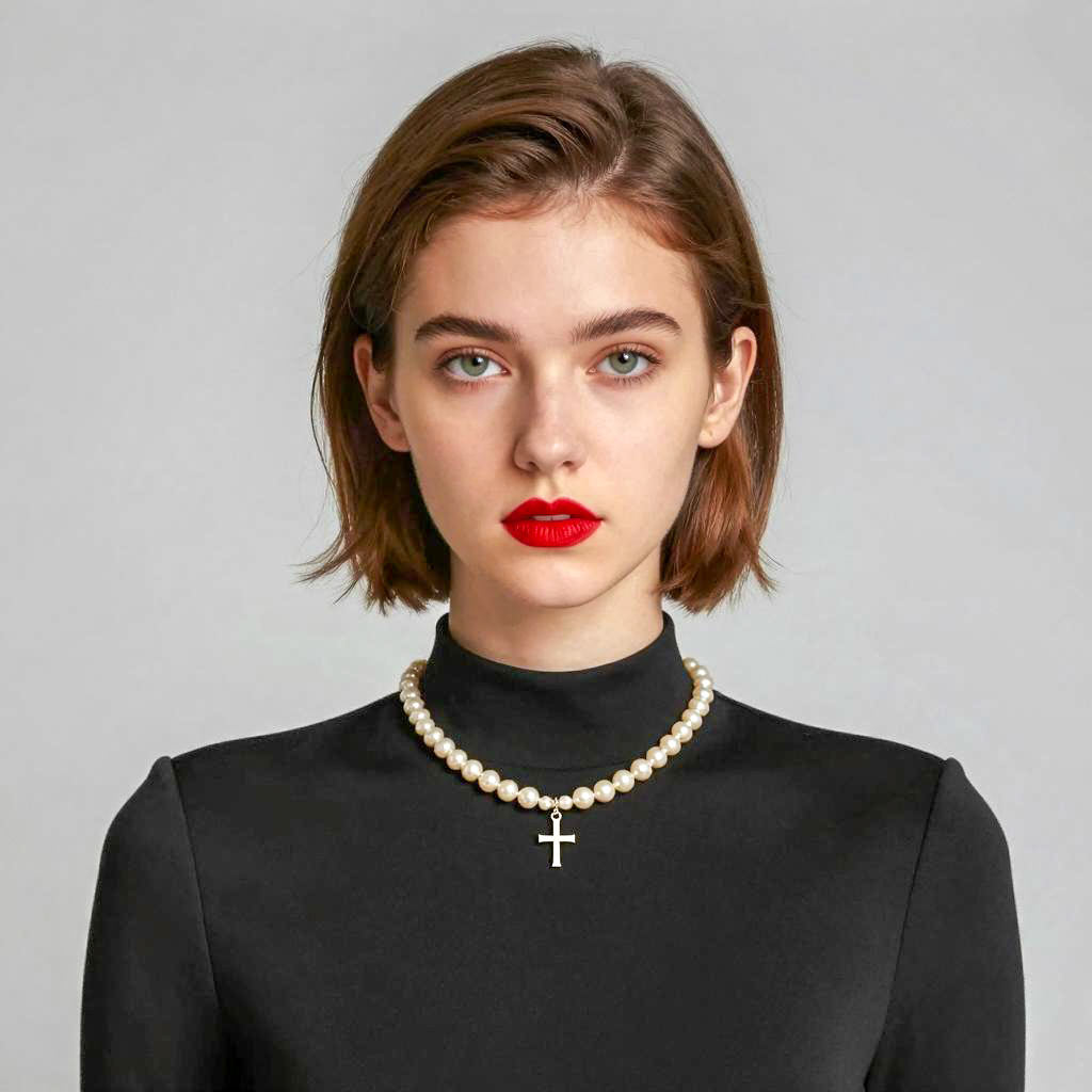 Close-up portrait of a young Caucasian woman with fair skin, green eyes, short brown hair, and red lipstick. She is wearing a black high-neck dress and a pearl necklace with a small cross pendant. The background is gray with studio lighting, highlighting her serious expression and minimal makeup.
