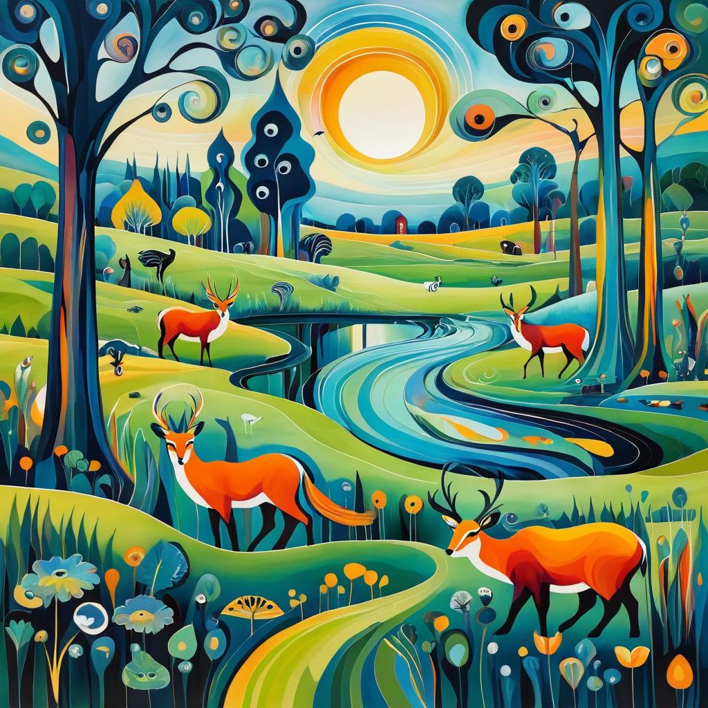 Colorful abstract painting depicting a vibrant nature landscape with a winding river, stylized trees, deer, birds, and mushrooms under a bright sky with swirling patterns.
