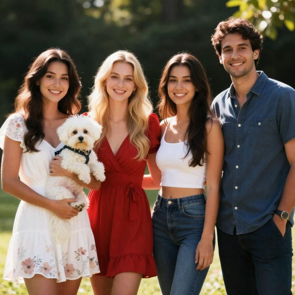 Photograph of four people standing outdoors. Three women, one man. Women: brunette in white floral dress holding small white dog, blonde in red dress, brunette in white crop top. Man: dark hair, blue button-up shirt. All smiling. Background: trees, sunlight.