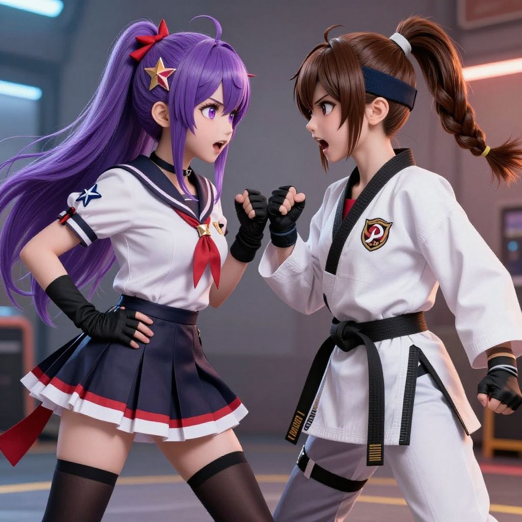 (Conjoined_dicephalus), (2 heads:1.2), two heads, (1 body:1.5), 2 girl, solo, 2 legs, 2 arms, conjoined twins, girlfriend, 2 different hairstyle, stylish hairstyle, 2 tone color hair, hair accessories, 2 tone character outfits, 2 different outfit separate in middle:1.2, half body, split body, (half right, YuriSaka, brown hair, braided ponytail, white karate clothes, yurims, HEADBAND, DOUGI, SPANDEX, GLOVES, FINGERLESS GLOVES, LEGGINGS), (half left, asamiya_schooldress_ownwaifu, gloves, hairband, long hair, purple eyes, purple hair, school uniform, fingerless gloves, red hairband, skirt, star (symbol), hair ornament, thighhighs, breasts, black thighhighs, serafuku, star hair ornament, choker, ribbon, hair ribbon, bangs, black gloves, bow), (fighting other character:2, open mouth:1, face to face:2, side face:1, very angry:2, look at each other:1), ramdom background, hyper-realistic, cinematic, 4K, vivid lighting, (highres, highly detailed:1.2), aesthetic, masterpiece, (two heads:1.5)