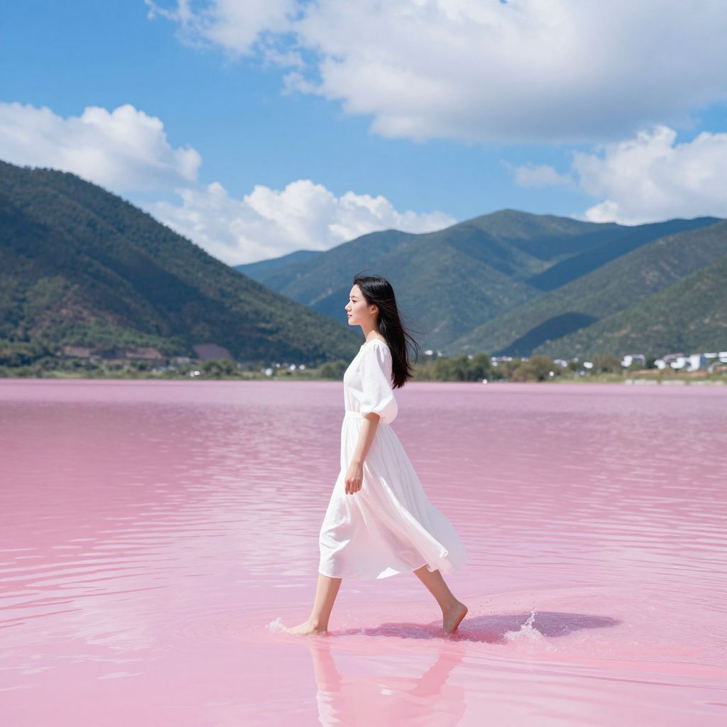 Photograph of a young Asian woman with long black hair walking barefoot in a surreal, pink lake. She wears a flowing, white dress that reaches her ankles. The background features lush, green mountains under a bright blue sky with fluffy white clouds. The pink lake creates a striking contrast with the woman's white dress. She is positioned slightly to the right, mid-stride, with her gaze directed forward. The water around her feet is calm, and the horizon line is visible in the distance. The overall scene is serene and ethereal.