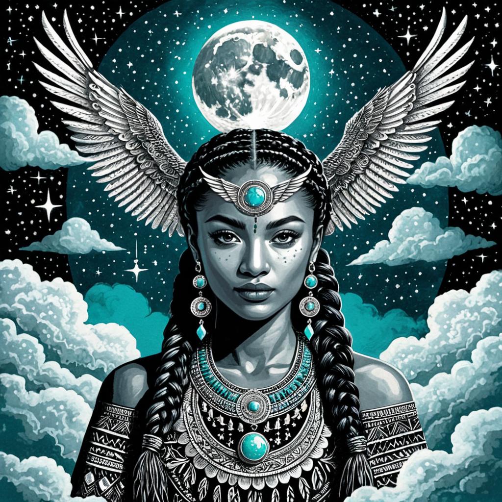 Block printing of a majestic lioness resting under an acacia tree, featuring bold tribal patterns and vibrant sunset hues. The woman’s features reflect Nigerian beauty with coiled hair and golden arm bracelets. Simplistic and modern, the design embodies goddess energy with vibrant vibes.