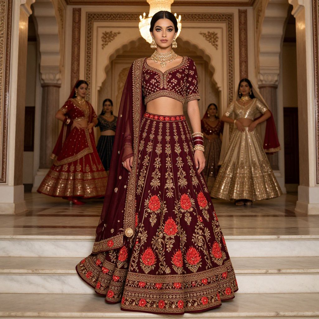 Photograph of a South Asian woman modeling a traditional bridal outfit in an ornate, archway-rich indoor setting. She wears a maroon lehenga with gold and red floral embroidery, a matching crop top, and a sheer maroon dupatta. Her jewelry includes a gold necklace, earrings, and bangles. She has dark hair styled in an elegant updo. Three other women in similar traditional attire stand in the background. The floor is marble, and the walls feature intricate patterns and archways, adding to the elegant and cultural ambiance. The lighting is warm, highlighting the rich colors and intricate designs.